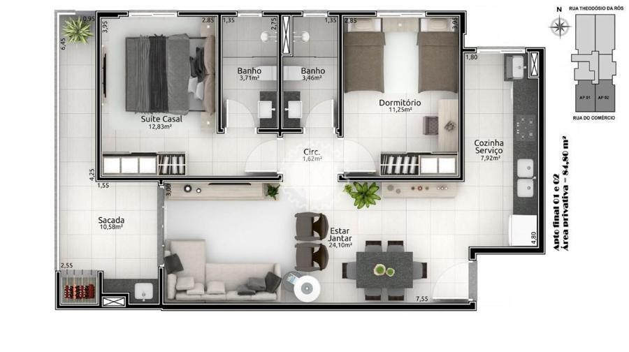 Final 01 e 02 - Aptos de 2 dormitórios com suíte e box de garagem ( 1 ou 2 box). Área privativa de 84,80 m².