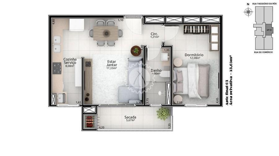 Final 03 - Aptos de 1 dormitório com 1 box de garagem. Área privativa de 53,60 m².