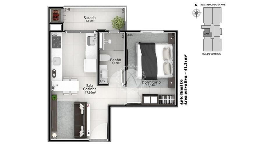 Final 06 - Aptos de 1 dormitório com 1 box de garagem. Área privativa de 42,50 m².