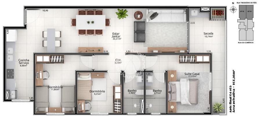Final 04 e 05 - Aptos de 3 dormitórios com suíte e 2 box de garagem. Área privativa de 107,60 m².
