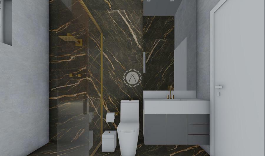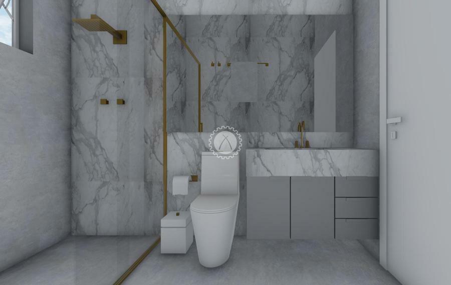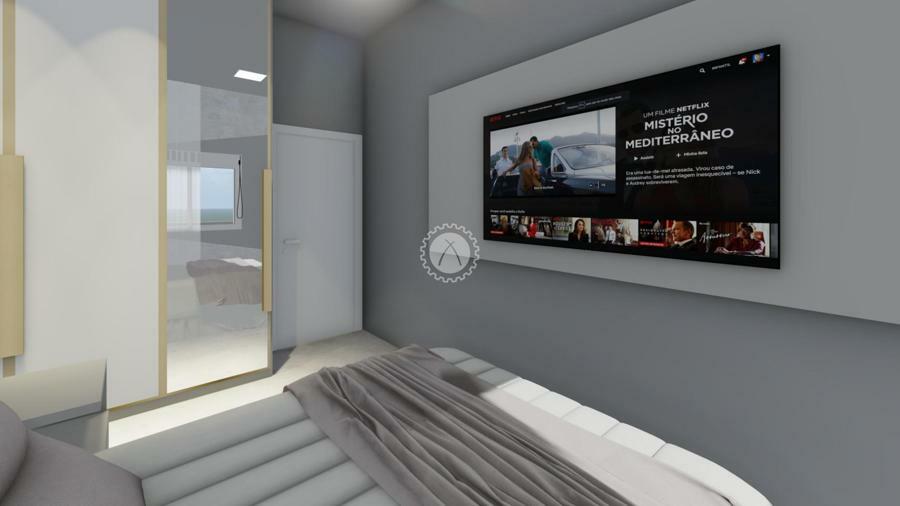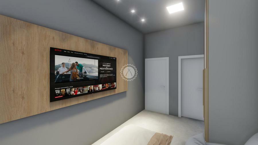 Piso em porcelanato e acabamento em gesso no teto;